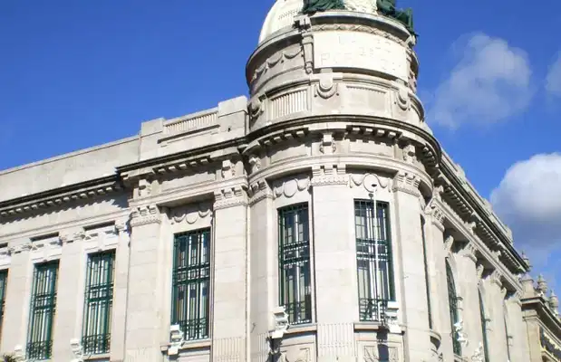 Another eye-catching building in Republic Square is home to the Bank of Portugal, on the corner of Rua dos Chaos. Its has a granite facade, is 2-storey with large windows protected by dark green bars. The corner of the building is formed by a sort of semi-circular tower topped with a dome on which there are two bronze sculptures, representing a man and a woman.