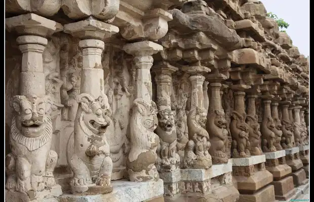 This is another of the 108 temples dedicated to Shiva that exist only in this city. This particular temple is regarded as the oldest, having been built in 700 AD, during the reign of the Pallava king Rayasimha. It is surrounded by a wall of sandstone, whereas the temple is built in red sandstone. Opposite the main entrance you can see a large sculpture of the bull Nandi, which appears like it's watching you. In the temples of Mahabalipuram, the lions that appeared at the feet of the columns were sat down, whereas here the lions are on their hind legs, as if ready to defend the temple. Inside, there are small altars in honor of Shiva.
