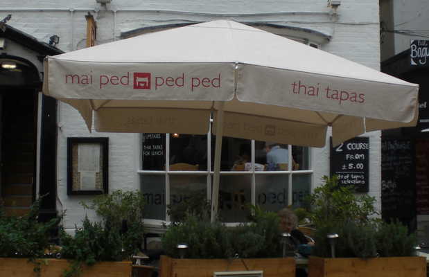 Mais Ped Ped is a Thai restaurant in The Lanes shopping district in pedestrian downtown Brighton. The coast is a five minute walk away and coveted by Londoners over the weekend. Opens at 11am and closes at 11pm. Tapas menu at noon, ie stuff like croquettes fried vegetables and fish, which get wet with sweet and sour sauce. The price is a bit expensive for what you get, and the service is slow around noon. Authentic Thai food, and some Chinese dishes. A heated terrace for eating outside in any weather.