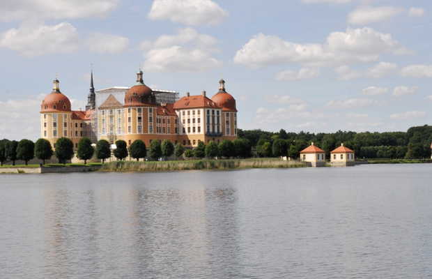 German Castle, a hunting lodge originally in the town of Moritzburg, close to Dresden. Its imposing yellow corner towers, and the lake surrounding it, make this castle one of the most significant examples of military architecture in Germany at the end of the 15th century. There is the collection of red deer antlers that is the world's biggest, along with a collection of Meissen porcelain. You have to pay to go inside the rooms and see the exhibits, but you can stroll around the grounds as you wish, free of charge.
